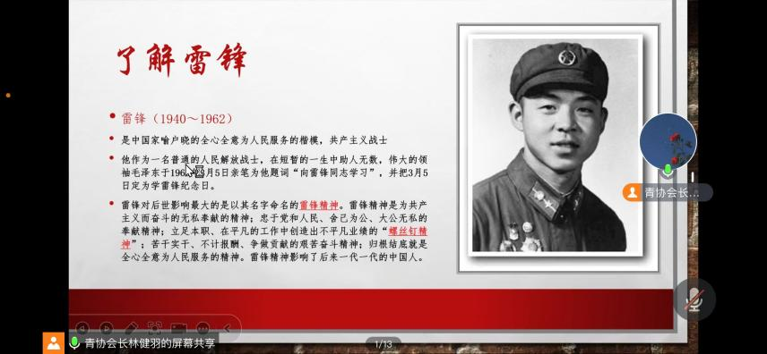 为传承和发扬雷锋精神,引导青年学生深入理解和践行雷锋精神,培养学生的社会责任感和使命感,提高学生的综合素质,3月14日,BWIN必赢,BWIN必赢团委组织部和青年志愿者联合会举办“扬雷锋精神,做时代新人”主题团日活动,2021级、2022级、2023级本科生各班团干参加,以线上宣讲方式进行。