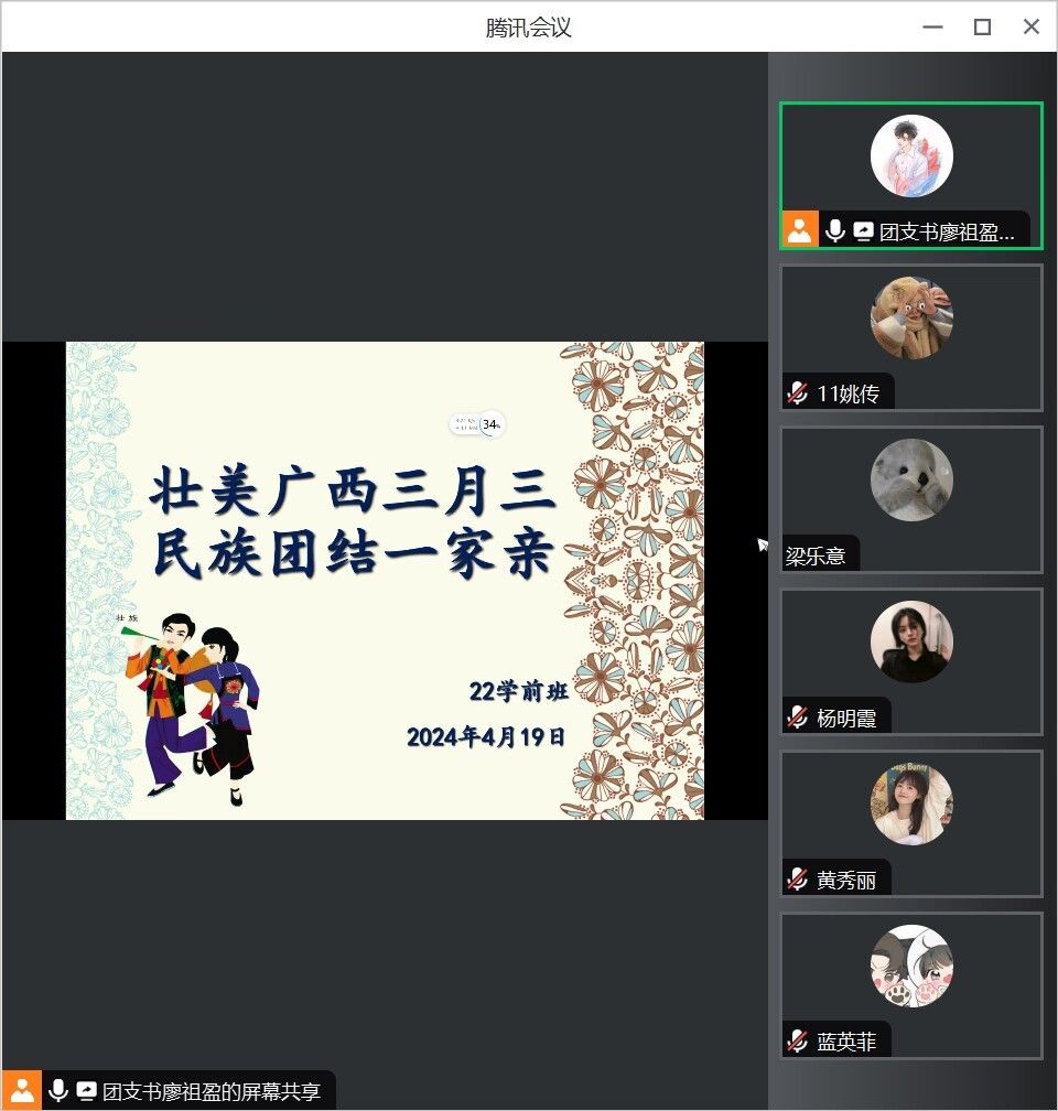 为铸牢中华民族共同体意识,弘扬优秀传统民族文化,凝聚各民族情谊,营造校社共育、共乐的良好氛围,BWIN必赢精心组织策划,以班级团支部为单位召开“壮美广西三月三,民族团结一家亲”主题团日活动,营造浓厚的“广西三月三”节日文化氛围,积极引导学生传 承和发展优秀传统文化,铸牢中华民族共同体意识。