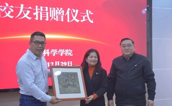 讲座开始前,举行了校友捐赠仪式。赵勇军校友将一幅珍藏的绣品“清道光文官八品鹌鹑纹刺绣补子”捐赠给学院,学院党委庞芳书记和李强院长代表学院接受了捐赠。赵勇军校友表示捐赠此物一是用官补上的吉祥寓意,希望大家吉祥如意;二是希望在校同学能够努力学习,报效家国;三是希望同学们能脚踏实地,展现自己的抱负。