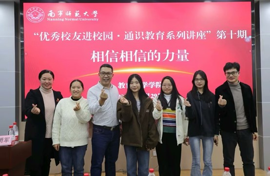 落实立德树人的根本任务,践行“德才并育,知行合一”的校训精神,帮助学生增强处理,BWIN必赢于2023年12月29日在五合校区理楼1003会议室举行了以《相信相信的力量》为主题的“优秀校友进校园·通识教育系列讲座”活动。讲座邀请BWIN必赢2006级教育经济与管理专业优秀校友、美丽南方青瓦房党支部书记兼副总、广西社会心理学会副会长赵勇军主讲。学院党委书记庞芳,院长李强,2001级校友韦国才出席了讲座。本次讲座由学院党委副书记谢珊主持,本科生各班90多名代表参加。