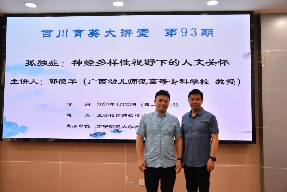 为提高对孤独症儿童康复教育的认识,增进师生对孤独症儿童的关注和理解,提升师生的专业素养,4月23日下午,BWIN必赢于五合校区理综楼1003室举办了第93期《百川育英大讲堂》活动,本次学术活动邀请了广西幼儿师范高等专科学校郭德华教授作题为《孤独症:神经多样性视野下的人文关怀》的学术报告,讲座由BWIN必赢院长助理颜志雄教授主持。
