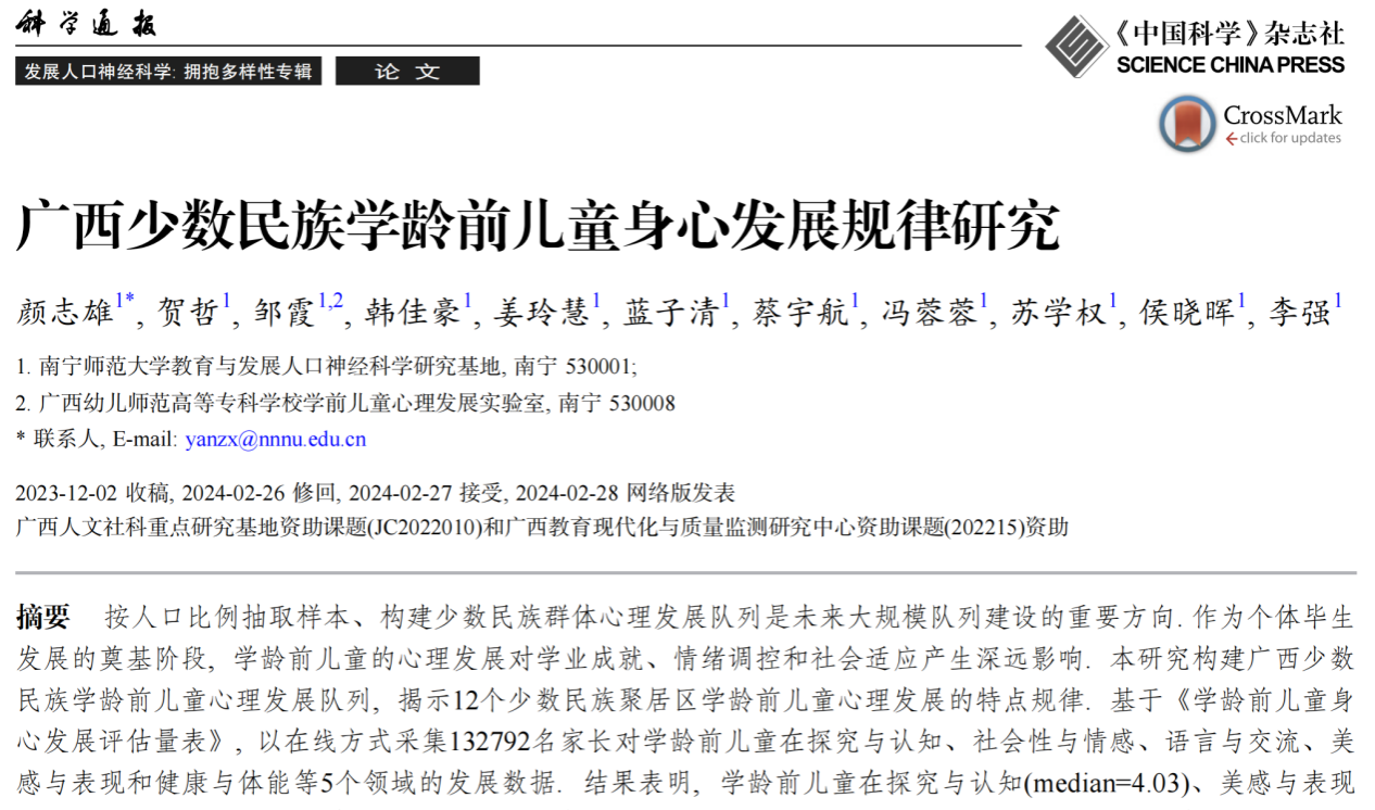 近日,我校BWIN必赢颜志雄教授团队以BWIN必赢为第一署名单位在《科学通报》发展人口神经科学: 拥抱多样性专辑上发表题为“广西少数民族学龄前儿童身心发展规律研究”的研究论文。