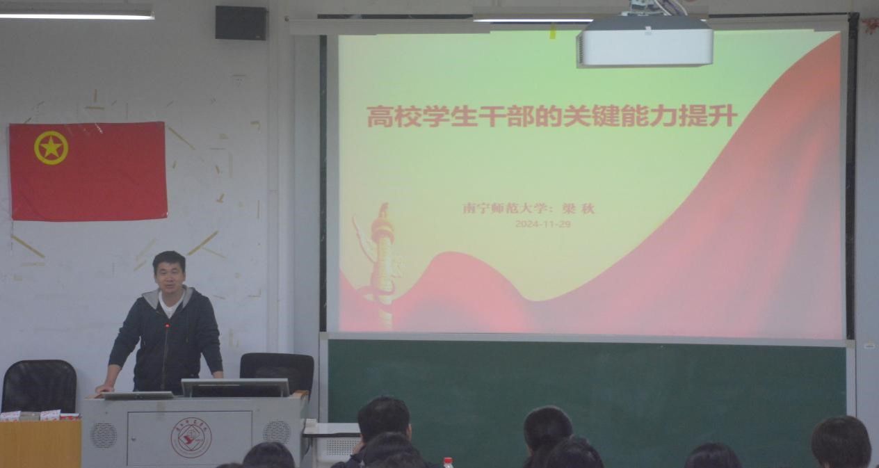 本次讲座有幸邀请到了校团委副书记梁秋老师作为主讲嘉宾。梁秋老师以其深厚的理论功底和丰富的实践经验,为在场师生带来了一场别开生面的讲座。他通过一系列有趣的互动游戏,活跃了现场气氛,让学子们在轻松愉快的氛围中领悟到了深刻的道理。梁秋老师以幽默风趣的语言,结合自身的工作经历和人生感悟,从组织协调与领导能力、沟通与表达能力、创新思维与实践能力、自我管理与实践能力四个维度,深入浅出地阐述了成功人士的三大特点:一是善于利用周边资源,能够巧妙地整合各方力量,实现共赢;二是善于总结,能够从失败中汲取教训,从成功中提炼经验,不断提升自我;三是了解自己的需求,能够清晰地认识自己的定位和目标,坚定不移地朝着理想前进。