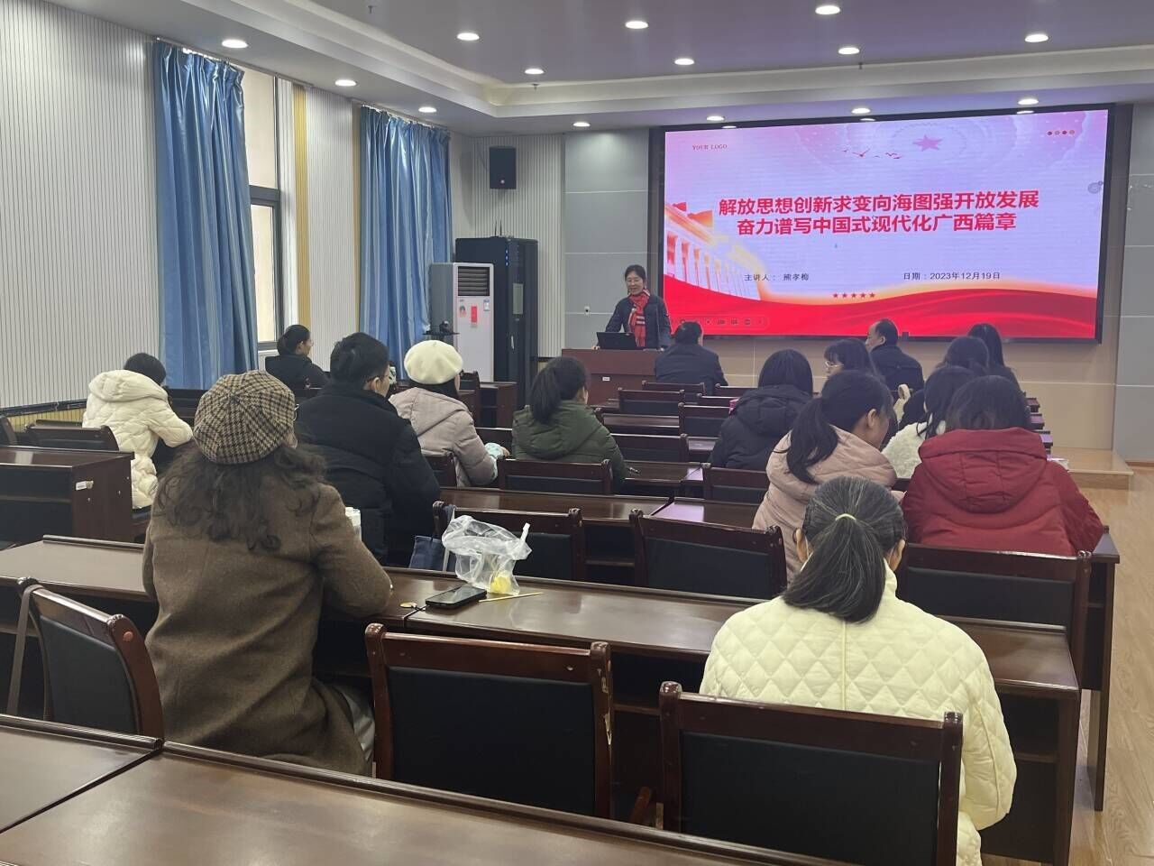培训会上,熊孝梅书记作了题为《解放思想创新求变向海图强开放发展 奋力谱写中国式现代化广西篇章》的主题培训。培训内容围绕习近平总书记12月14—15日在广西考察时强调的四个主题展开,这四个主题分别是:第一,希望广西持续扩大与东盟各领域间的对外开放;第二,强调广西建设铸牢中华民族共同体意识示范区从基层社区抓起搞好民族团结;第三,强调广西要把蔗糖优势产业做强做大;第四,希望广西加快构建现代农业产业化体系。习近平总书记强调,广西要完整、准确、全面贯彻新发展理念,牢牢把握高质量发展这个首要任务和构建新发展格局这个战略任务,发挥自身优势,以铸牢中华民族共同体意识为主线,解放思想、创新求变,向海图强、开放发展,努力在推动边疆民族地区高质量发展上展现更大作为,在建设新时代中国特色社会主义壮美广西上不断取得新进展,奋力谱写中国式现代化广西篇章。